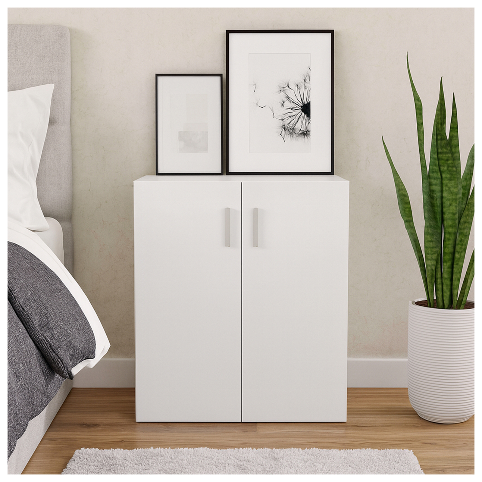Diese moderne Kommode überzeugt durch ihr zeitloses Design und ihre vielseitige Einsetzbarkeit. Mit den kompakten Maßen von 60 x 77 x 30,5 cm (B/H/T) passt sie perfekt in Wohnzimmer, Schlafzimmer, Kinderzimmer, Flur oder Büro. Hinter den beiden Türen befinden sich 2 praktische Regalfächer, die idealen Stauraum für Geschirr, Bücher, Kleidung, Spielzeug oder andere Alltagsgegenstände bieten. Dank der stabilen Spanplatten-Konstruktion und der 4 Standfüße hat die Kommode einen sicheren Stand. Sie lässt sich außerdem hervorragend mit weiteren Möbelstücken der Serie kombinieren und sorgt so für ein harmonisches Gesamtbild in Ihrem Zuhause. Ob als Sideboard, Anrichte oder Aufbewahrungsschrank – diese Kommode ist ein echtes Allroundtalent und schafft Ordnung mit Stil. Innenmaße siehe Abbildung