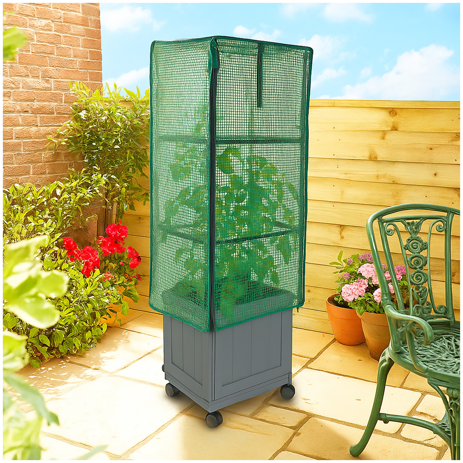 Sie möchten Ihr eigenes Gemüse anpflanzen, besitzen aber keinen Garten? Mit dem Pflanzkübel Nessa ist das auf kleinstem Raum, wie auf Balkon und Terrasse, möglich. Hergestellt aus robustem Kunststoff wird der Pflanzkübel mit Rankgitter und Folienabdeckung zum Gewächshaus. Das sorgt bei der Anzucht von Gurken und Tomaten für ein optimales Wachstum. Über das Öffnen der Folie kann dabei die Temperatur und Luftfeuchtigkeit reguliert werden. Das Gewächshaus schützt Ihre Pflanzen zudem vor Wittereinflüssen und verhilft so zu einer reichen Ernte. Dank Rollen kann der Pflanzkübel transportiert und immer wieder neu platziert werden. Maße B/H/T 30 x 106 x 30 cm