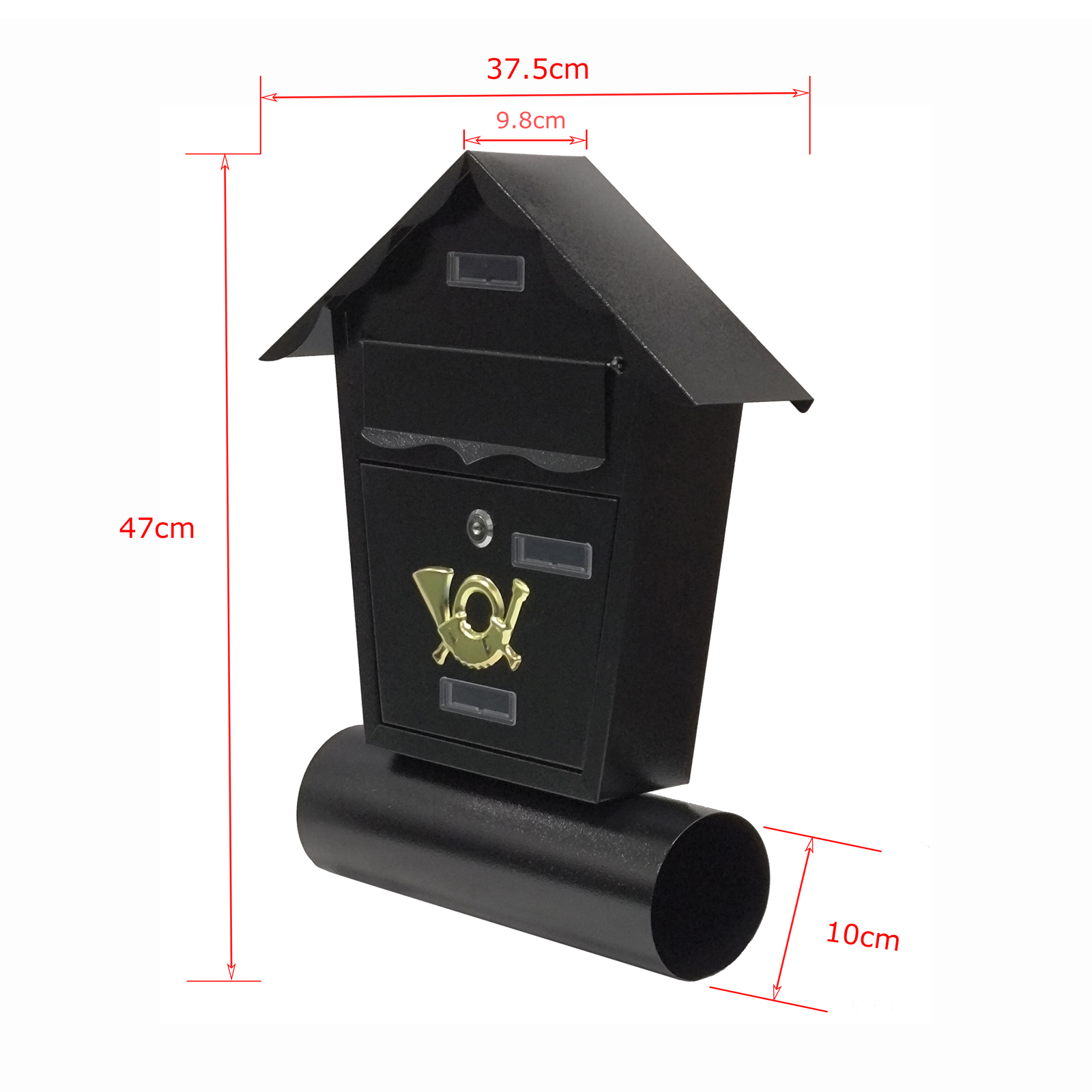 Der Briefkasten Amin mit Spitzdach bietet nicht nur einen sicheren und wetterfesten Platz für Ihre Post, sondern ist auch dekorativer Blickfang an der Hauswand. Die Front mit nostalgischem Posthorn setzt besondere Akzente. Hergestellt aus 0,6 mm dickem Stahl weist der Briefkasten dank galvanischer Oberflächenbeschichtung eine erhöhte Korrosionsbeständigkeit und Verschleißfestigkeit auf. So werden Sie lange Ihre Freude daran haben. Ein zusätzliches Zeitungsfach rundet das Design perfekt ab. Maße B/H/T 37 x 47 x 10 cm, Brieföffnung 17,5 x 3 cm, Zeitungsrolle Ø 10 cm