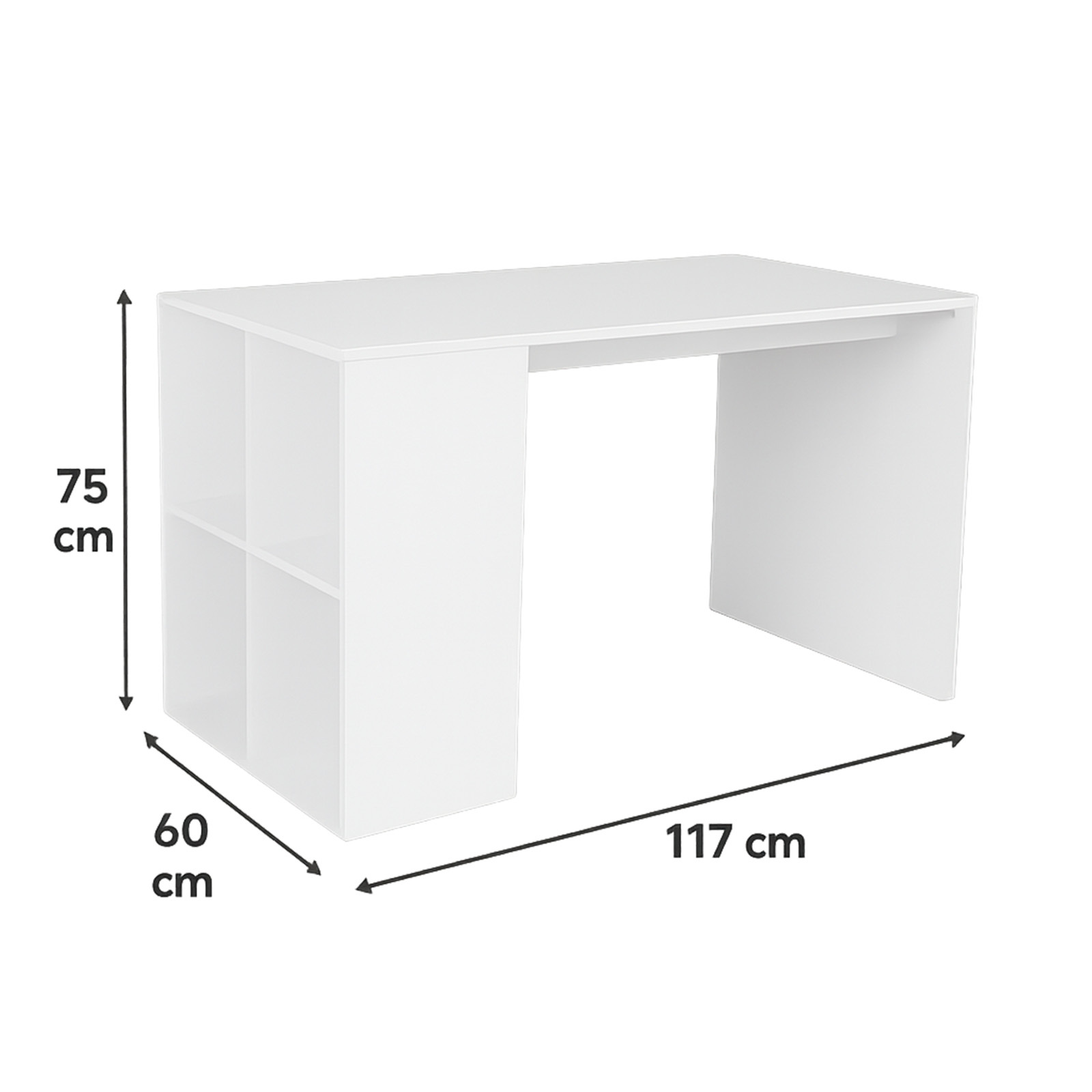 Dieser moderne Schreibtisch mit praktischem Stauraum bietet die perfekte Lösung für Homeoffice, Büro oder Jugendzimmer. Mit seiner kompakten Größe von 117 x 75 x 60 cm passt er auch in kleinere Räume und überzeugt durch sein minimalistisches Design. Die seitlichen Ablagefächer sorgen für Ordnung und zusätzlichen Stauraum für Ordner, Bücher oder Büromaterial. Robustes Material und eine pflegeleichte Oberfläche machen den Schreibtisch langlebig und alltagstauglich.