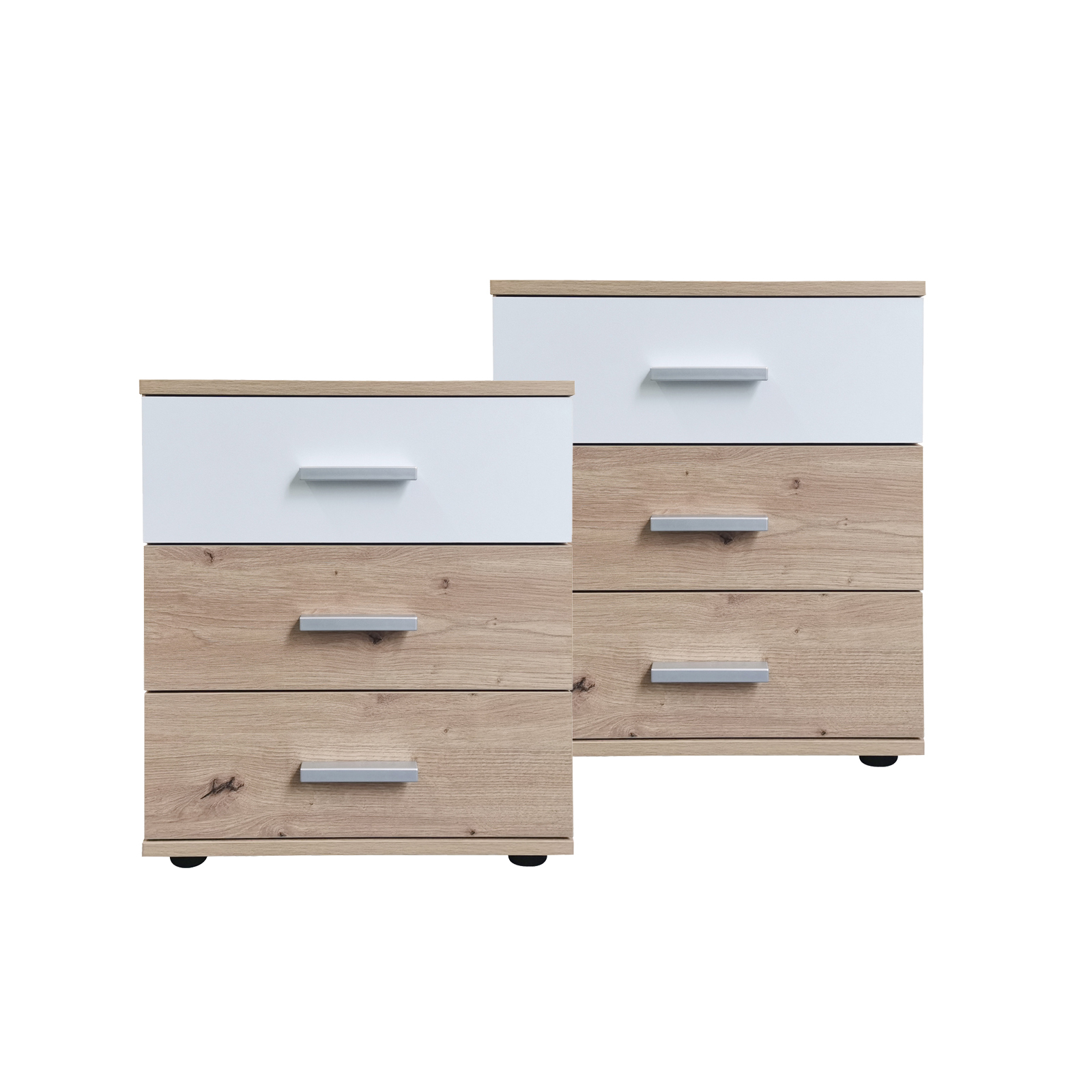Die drei Schubladen sind mit eleganten silberfarbenen Griffen ausgestattet und lassen sich leicht öffnen und schließen. Dank der klaren Linien und der zeitlosen Optik lässt sich der Nachtschrank problemlos in unterschiedliche Einrichtungsstile integrieren.