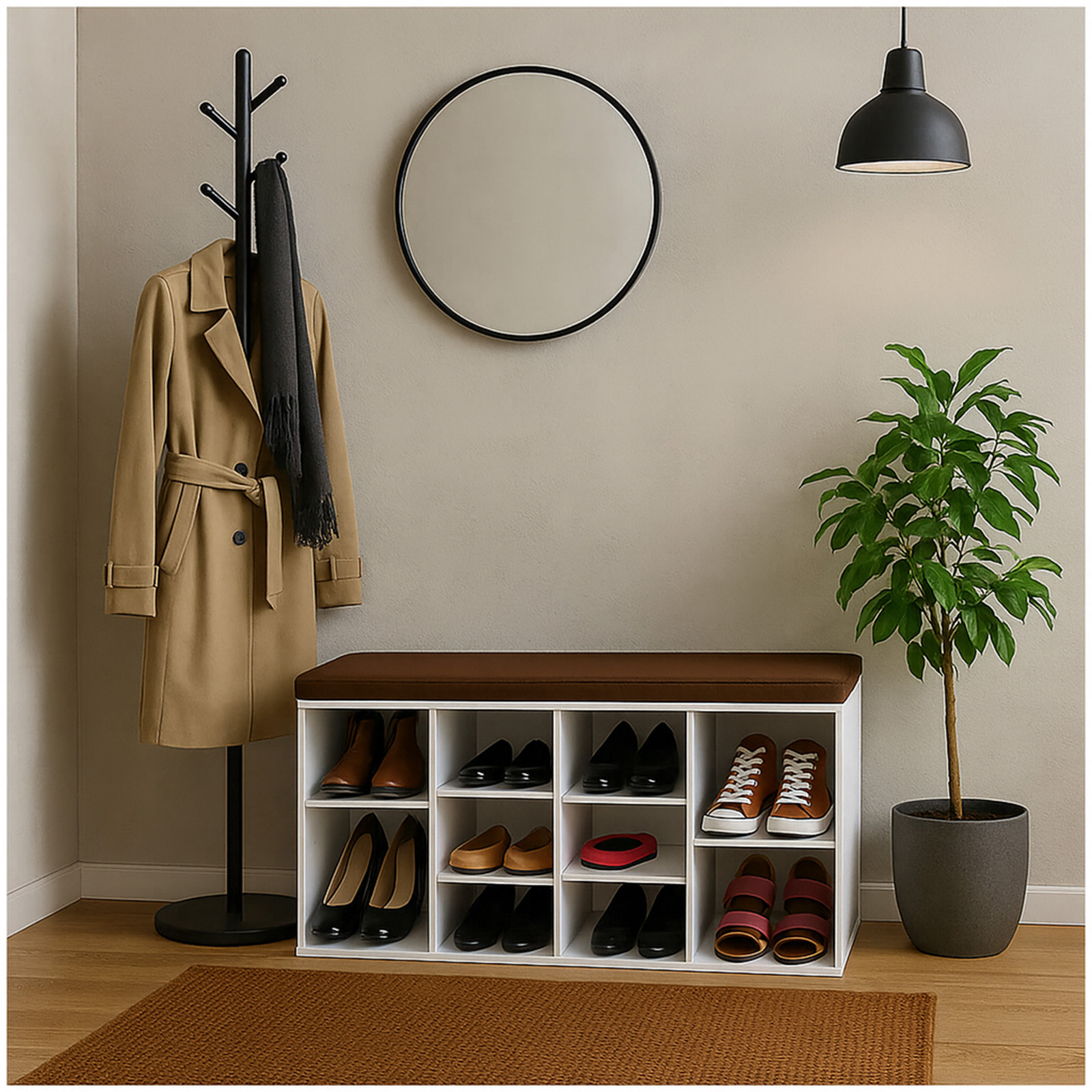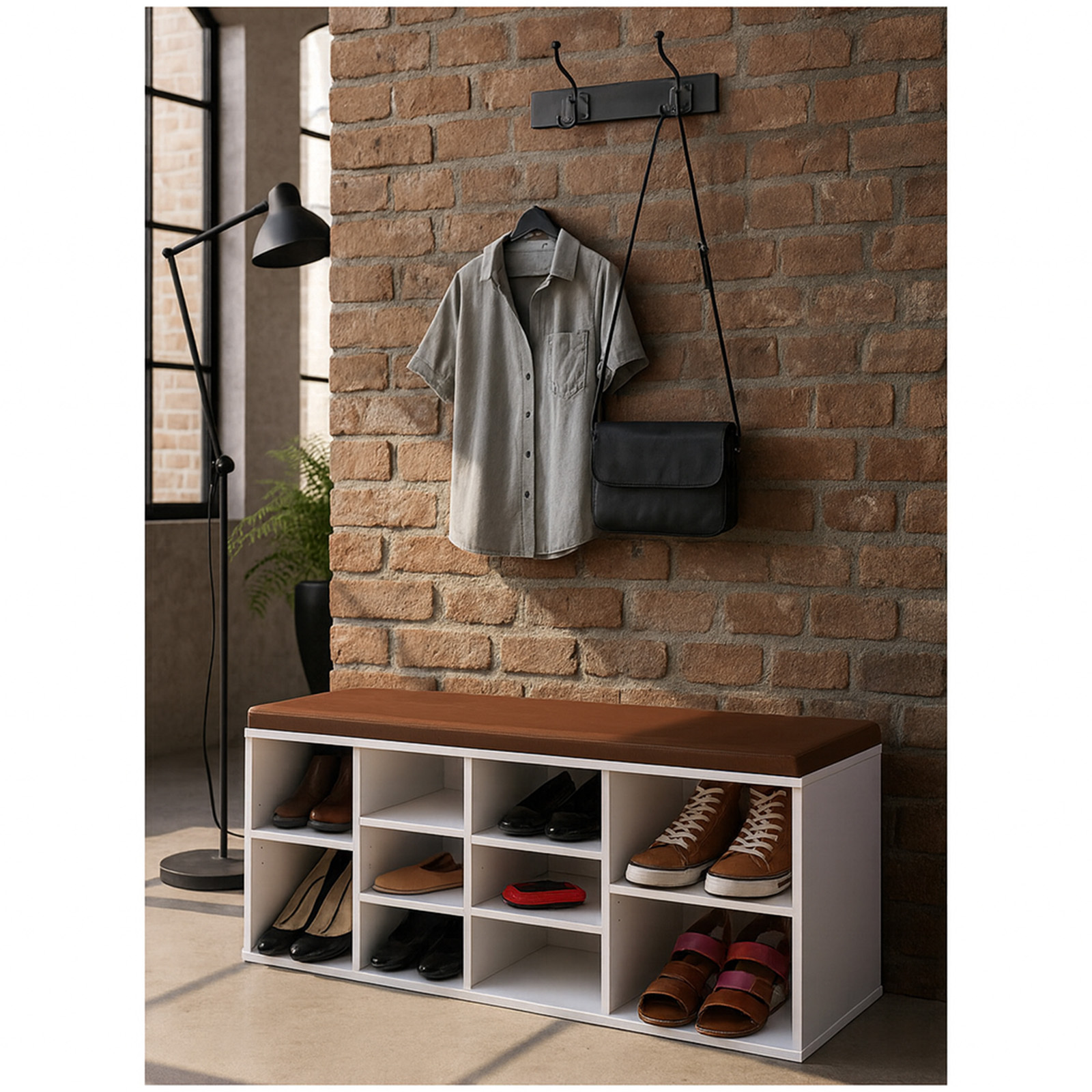 Praktisch, modern und bequem – die Schuhbank mit Sitzkissen bietet nicht nur viel Stauraum für Ihre Schuhe, sondern auch eine komfortable Sitzgelegenheit. Mit insgesamt 10 Fächern lassen sich Sneakers, Pumps, Slipper oder Kinderschuhe ordentlich verstauen. Dank des weichen Sitzkissens in Anthrazit können Sie sich bequem hinsetzen, um Schuhe anzuziehen. Die Bank ist ideal für Flur, Garderobe oder Schlafzimmer und sorgt für Ordnung und Gemütlichkeit. Technische Daten Maße B/H/T: 104 x 48 x 30 cm Farbe Korpus: Weiß Farbe Kissen: Anthrazit Material: Holzwerkstoff, Polyester (Kissen) Ausstattung: 10 offene Fächer, Sitzkissen abnehmbar Belastbarkeit: bis ca. 120 kg Lieferumfang 1x Schuhbank mit 10 Fächern 1x Sitzkissen Anthrazit 1x Aufbauanleitung