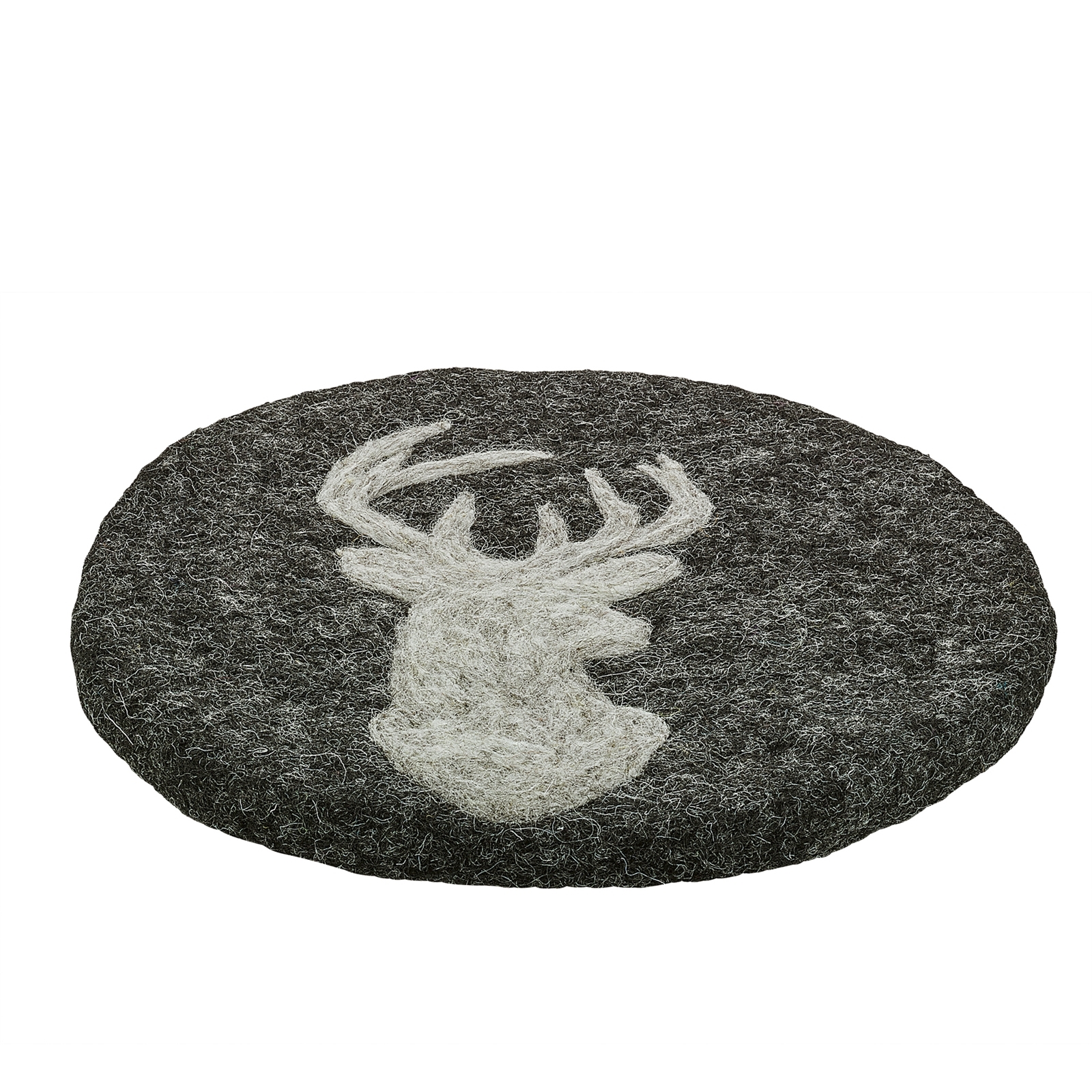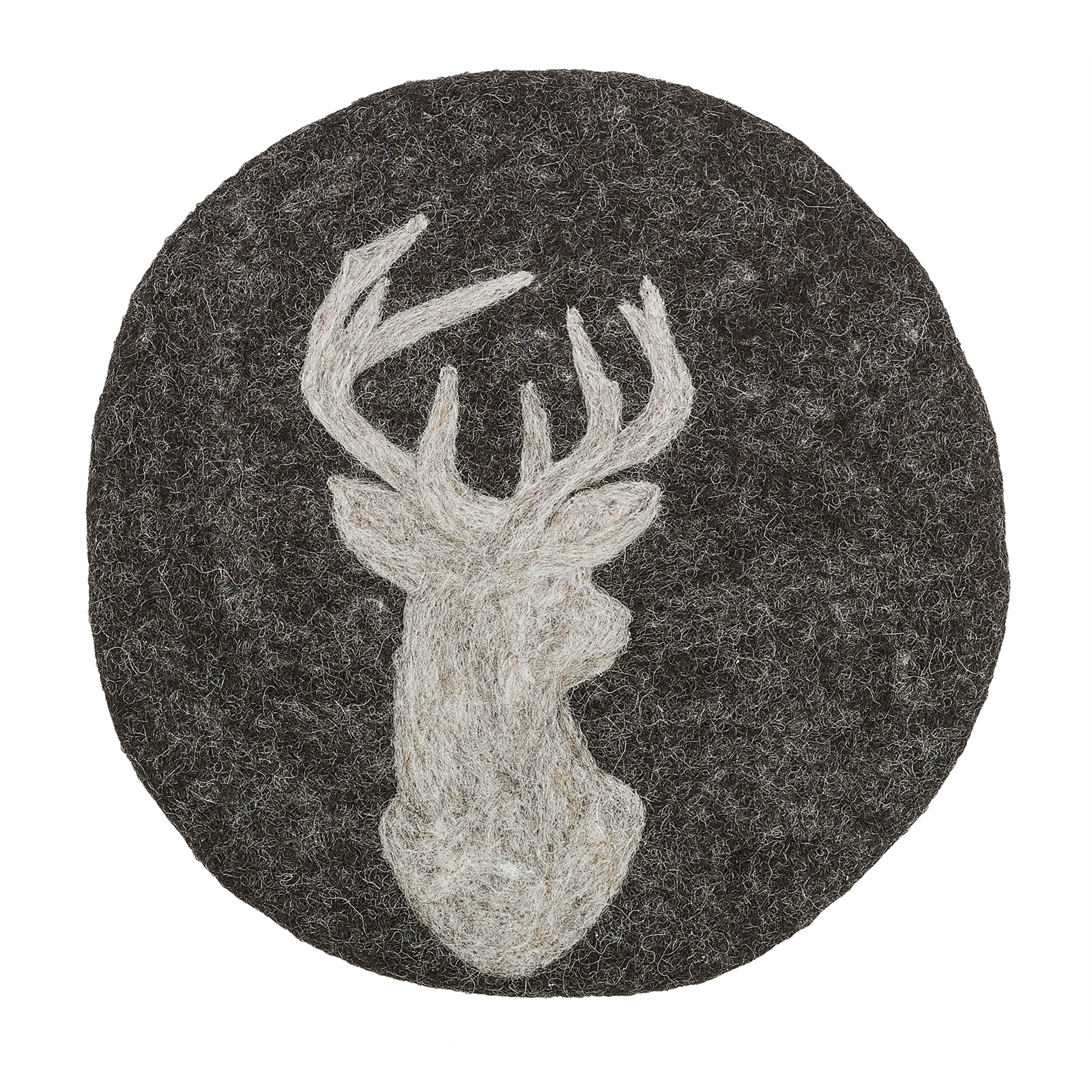 Handgefertigter und fair gehandelter Topfuntersetzer aus Schafwolle mit Hirschmotiv. Hitzebeständig bis 100°C und waschbar. Durchmesser 21 cm